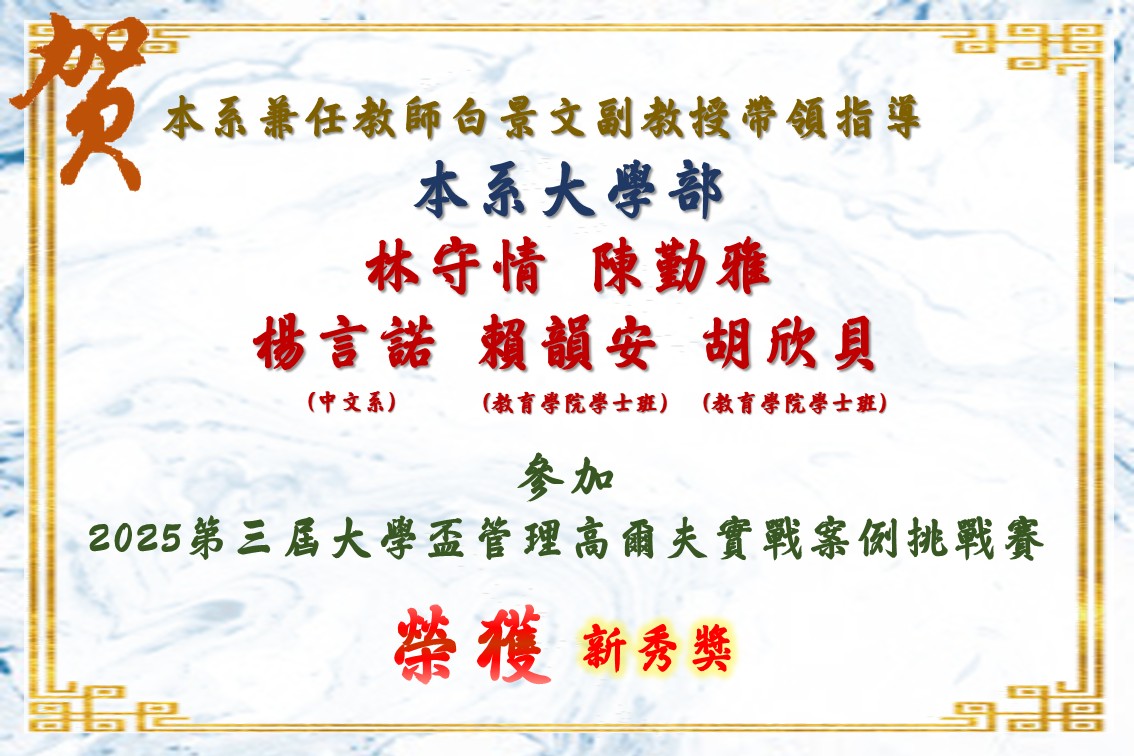 賀!本系兼任教師白景文副教授帶領指導本系大學部同學參加2025第三屆大學盃管理高爾夫實戰案例挑戰賽榮獲新秀獎