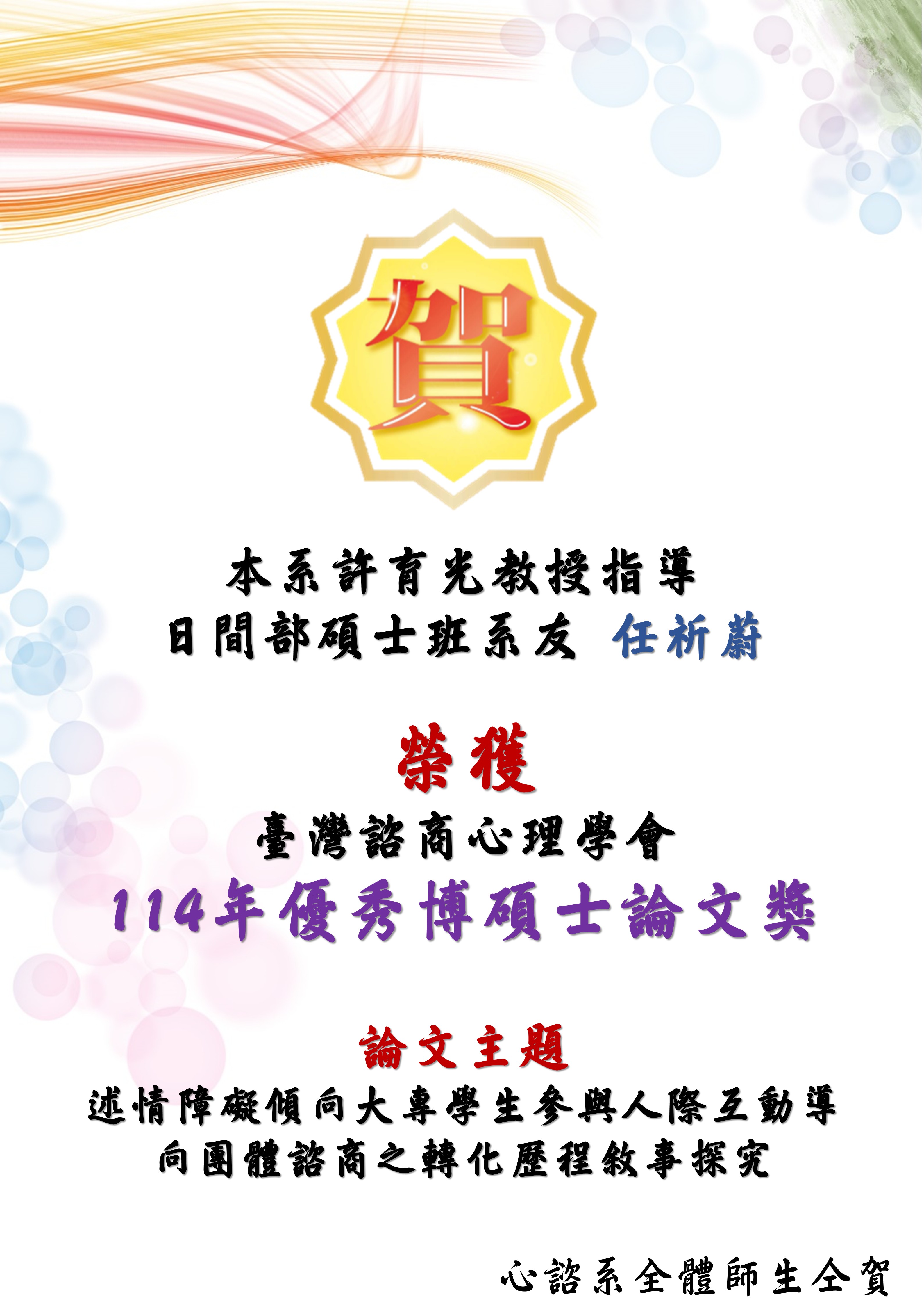 賀!!本系許育光教授指導碩士班系友任祈蔚畢業論文「述情障礙傾向大專學生參與人際互動導向團體諮商之轉化歷程敘事探究」獲臺灣諮商心理學會「114年優秀博碩士論文獎」